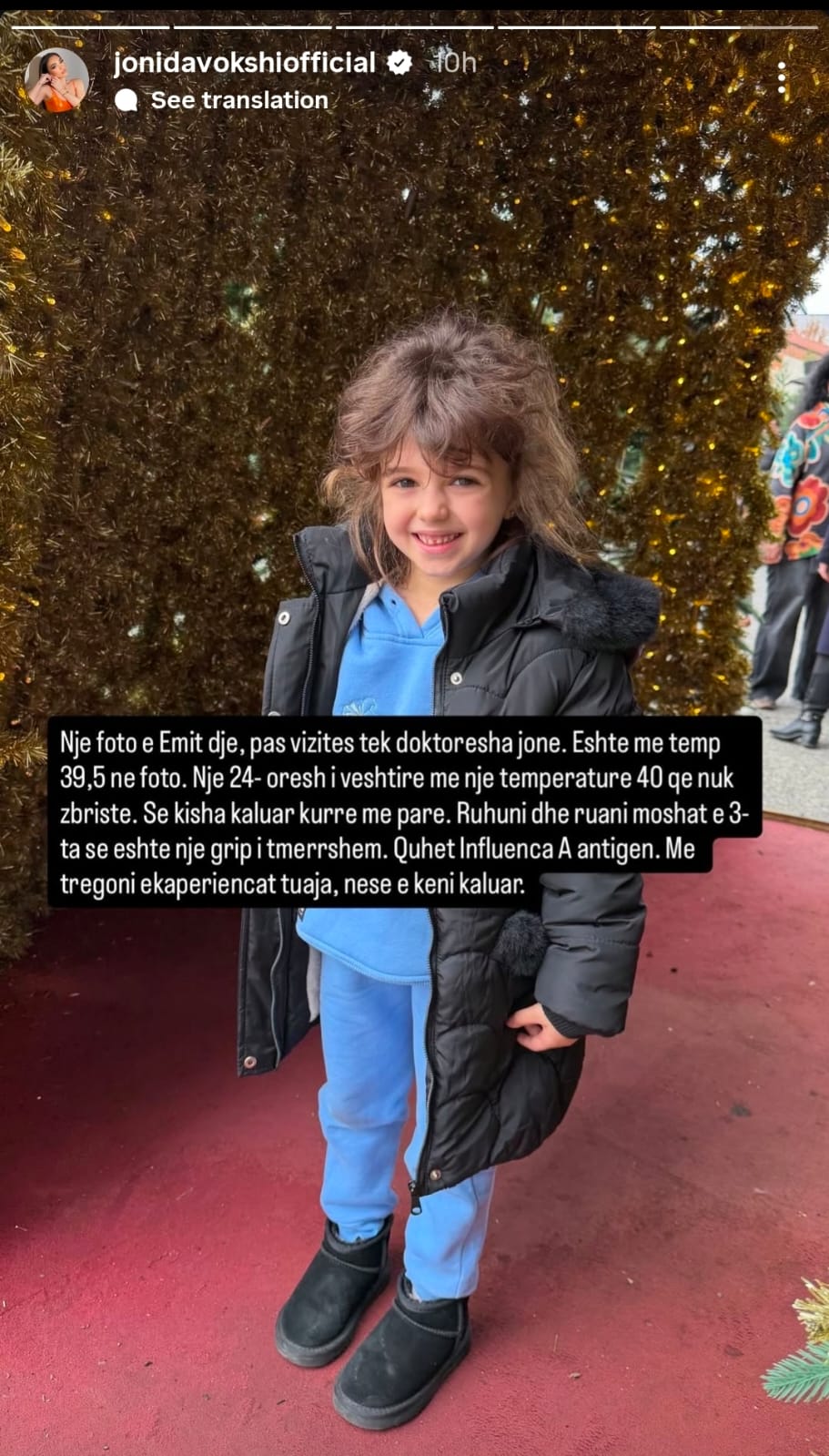 Sipas postimit të moderatores, Emi ka kaluar një 24-orësh shumë të vështirë, ku temperatura ka arritur deri në 40 gradë dhe ka qenë e vështirë për t’u ulur. Jonida thekson se kjo situatë ka qenë e panjohur më parë për të, duke u bërë thirrje prindërve dhe personave që kujdesen për moshat e treta që të bëjnë kujdes maksimal pasi ky grip është “i tmerrshëm”.