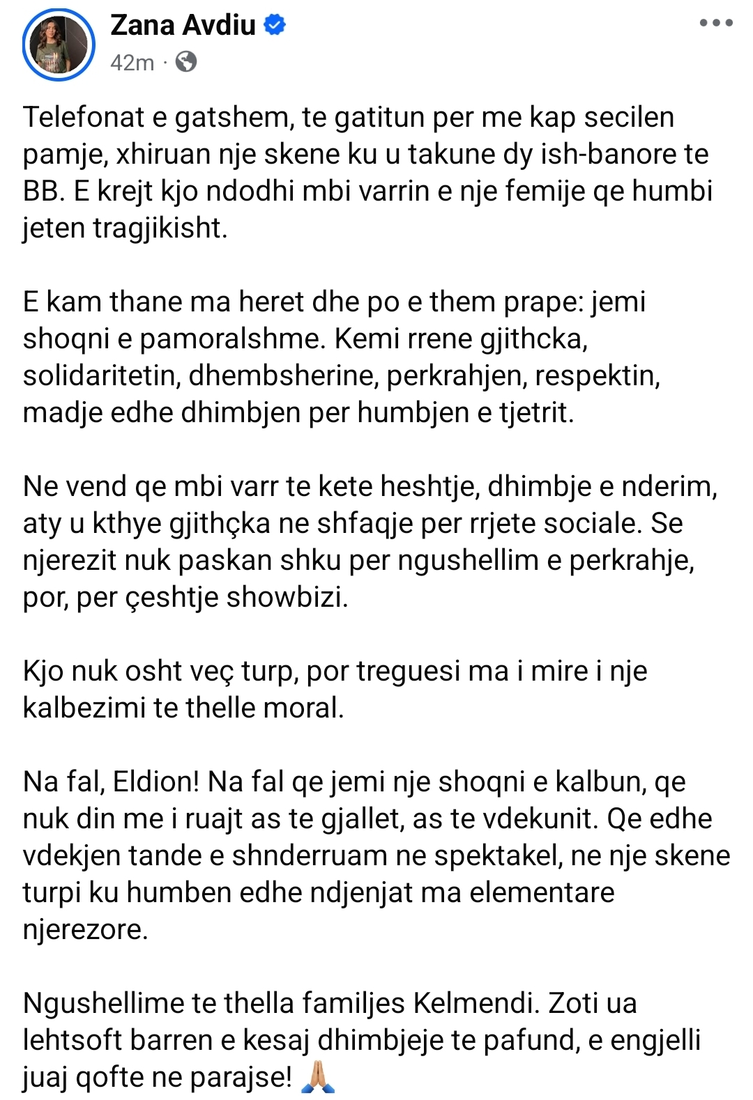 “Na fal, Eldion! Na fal që jemi një shoqëri e kalbun, që nuk din me i ruajt as të gjallët, as të vdekunët. Që edhe vdekjen tande e shndërruam në spektakël, në një skenë turpi ku humben edhe ndjenjat më elementare njerëzore”, shkruan Avdiu, duke shtuar ngushëllime të thella për familjen Kelmendi.