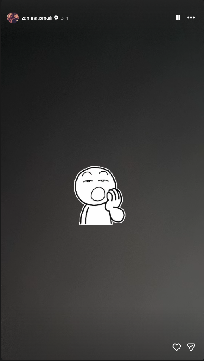 Ndërkohë, Zanfina Ismaili ka qenë shumë minimaliste, por mjaft e qartë në qëndrimin e saj. Këngëtarja ka publikuar vetëm një emoji duke gogësirë në një sfond të zi, duke lënë të nënkuptohet se deklaratat e gjata dhe kërcënimet me padi e kanë mërzitur dhe nuk i bëjnë fare përshtypje.